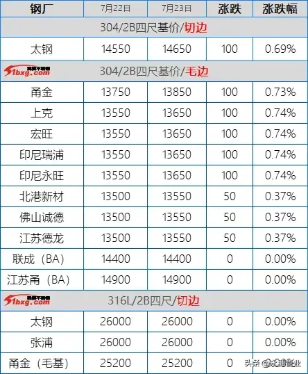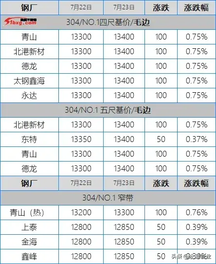 今日,青山鋼廠盤價漲100:熱軋窄帶13300元/噸,熱軋大板13400元/噸。旗下代理雖有跟高報價,但仍有讓利政策,具體報7月資源:鼎信304冷軋窄帶13200元/噸,熱軋窄帶13300元/噸;30478冷軋窄帶12700元/噸。304熱軋大板13430元/噸,30478熱軋大板12900元/噸。