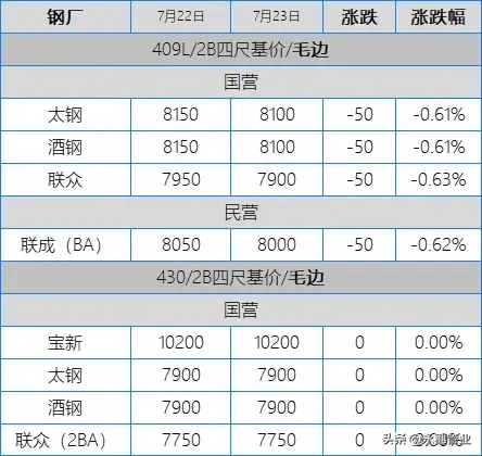 目前市場主流報價:410S熱軋黑皮在6100-6150元/噸;430熱軋黑皮在6700-6800元/噸;太鋼/酒鋼430/2B(毛)在7850-7950元/噸;聯眾430/2BA(毛)在7700-7800元/噸;宏旺430/2BA(毛)在7700-7800元/噸;甬金430/BA(毛)在8300元/噸左右;上克430/BA(毛)在8250元/噸左右;宏旺430/BA(毛)在8100-8200元/噸;瑞鋼430/2BA(毛)在7650-7700元/噸,其中期貨價在7800元/噸左右;聯成430/BA(毛)在8200元/噸左右。