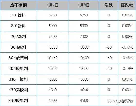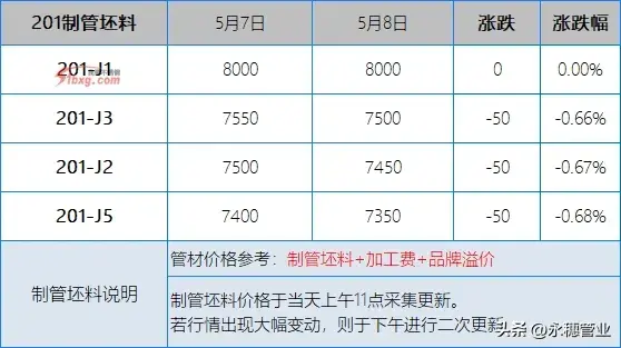 較昨日早間,今日早間市場201報價多數持平,個別下跌50元/噸;304報價下跌20-50元/噸,個別高位下跌100元/噸,目前主流報價區間:201新料在5850-5950元/噸;304新料在10400-10500元/噸。