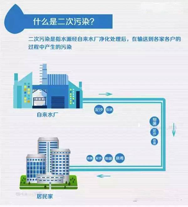 顧名思義,二次污染是指水源經自來水廠凈化處理后,在輸送到各家各戶的過程中產生的污染。主要是一些水管老化出現的鐵銹、泥沙、細菌、病毒等雜質和自來水廠氯制劑消毒后的副產物。二次污染的污染源主要有自來水管道、小區二次供水系統和水龍頭。