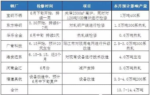 6月份鋼廠檢修情況匯總