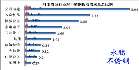 結合上面河南省各區域的統計數據,河南省不銹鋼板卷主要應用于五大行業,需求量達16.32萬噸,合計占比80.4%;三大重點行業需求量達12.59萬噸,合計占比62.0%。數據反映河南省各市不銹鋼消費結構雖然各有特色,但由于各地區差異化消費發展較為合理,使得整體上河南下游不銹鋼消費結構較為均衡。從調研數據另一面也可以反映出河南省不銹鋼需求結構穩定,市場風險較小。